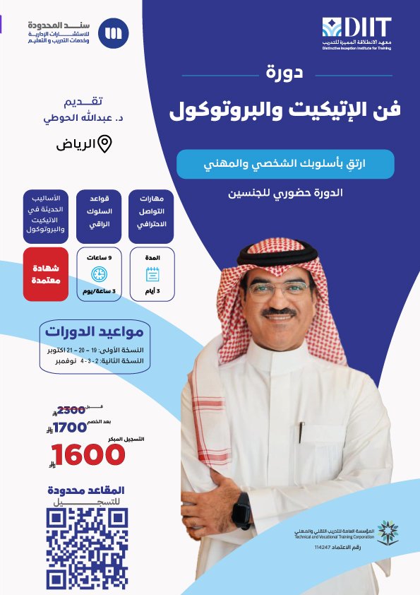 دورة فن الإتيكيت والبروتوكول تهدف إلى تطوير المهارات السلوكية والاجتماعية والمهنية لتمكين المشاركين من التعامل بثقة ولباقة في مختلف المواقف، وذلك بتعريفهم بأسس وقواعد الإتيكيت والبروتوكول، وتزويدهم بمهارات التواصل الفعال، وآداب المظهر، وفن التعامل مع الشخ